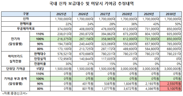 완성차업체들이 올해부터 목표치의 10% 미달을 누적했다고 가정할 경우 2030년까지 5년간 기여금 총액은 7518억원이 된다. 같은 기간 20% 미달을 가정할 경우엔 벌금이 1조5036억원으로 불어난다.