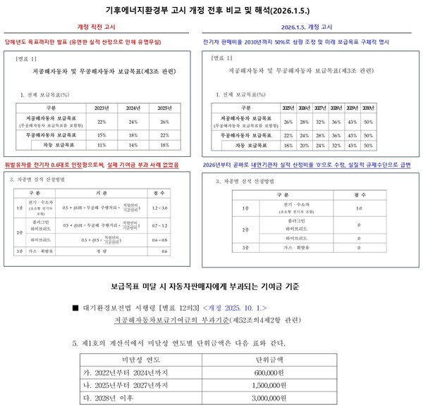 그런데 지난해 들어선 이재명 정부는 해당 정책에 강제성을 부여했다. 기후에너지환경부(옛 환경부)는 올 1월 5일 대기환경보전법(제58조의 2, 저공해자동차의 보급)을 개정해 보급 목표 미달시 기여금을 부과하기로 했다. 사실상 과징금이다.