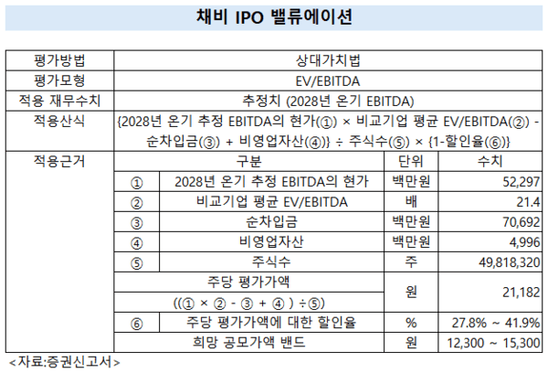 채비는 EV/EBITDA 평가방식을 택했다. 공모밸류가 5866억~7297억원인데 평가밸류 1조534억원에 27.8~41.9% 할인율을 적용한 결과다. 평가밸류는 EV(엔터프라이즈밸류) 1조1191억원에서 지난해 3분기말 기준 순차입금(706억원)을 빼고 같은 기간 비영업자산(50억원)은 더한 수치다.