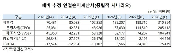 지난해 잠정 집계한 매출이 1022억원인데 48%는 CPO(489억원)에서, 나머지 52%는 EVSE에서 발생했다. 채비는 중립적 시나리오로 2028년에는 매출이 3103억원으로 2025년대비 203.5% 늘어날 것으로 봤다.