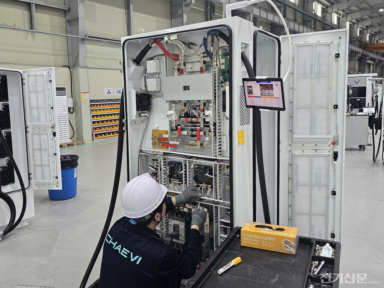 ▲ 채비 직원이 조립 작업 표준서를 확인하며 급속충전기를 조립하고 있다. [사진=오철 기자]