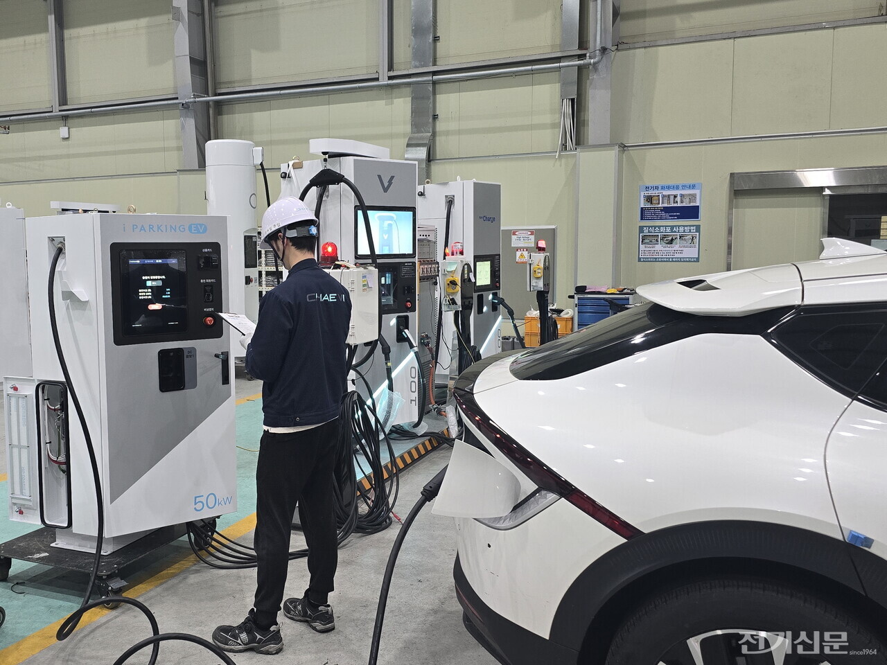충전 호환성과 안전을 검증하는 실차 테스트 구역에는 테슬라 모델3부터 구형 SM3 ZOE까지 13종의 전기차가 상시 대기한다.