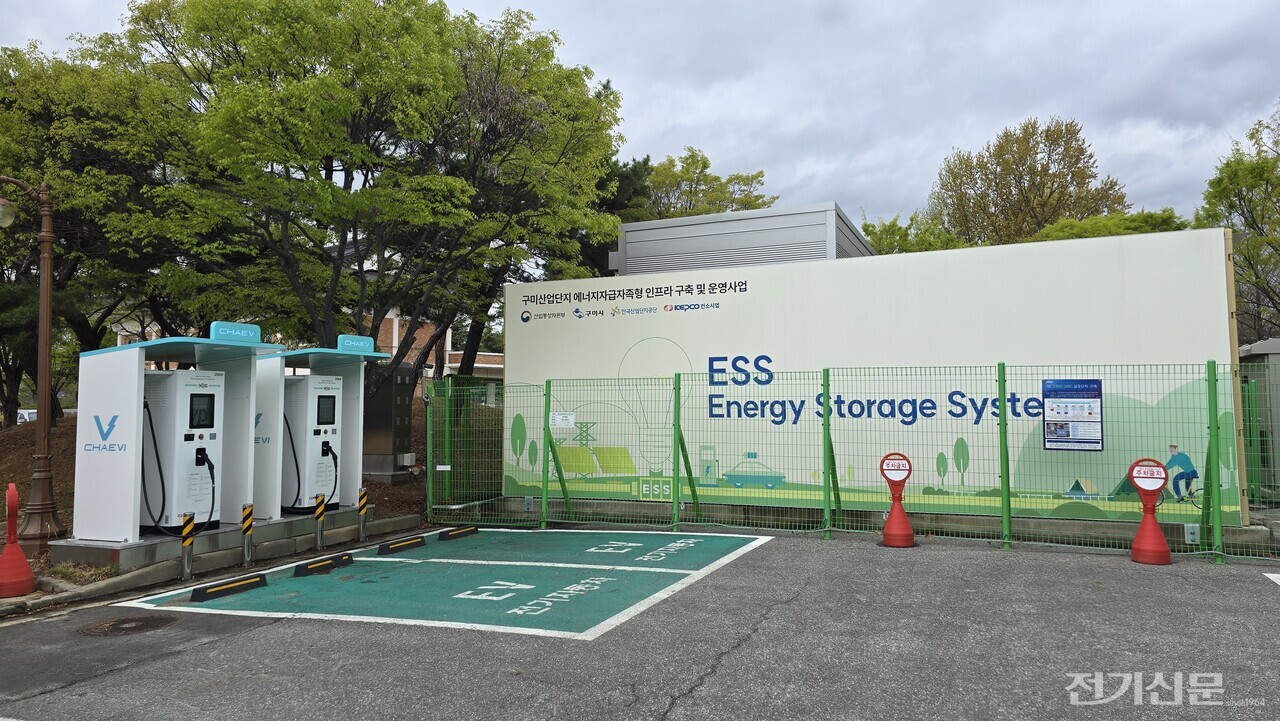 구미 공장을 나서 낙동강변 동락공원 제2주차장으로 이동했다. 산업통상부와 구미시, 한전이 주도하고 채비가 컨소시엄으로 참여한 저전압 직류(LVDC) 마이크로그리드 실증단지다.