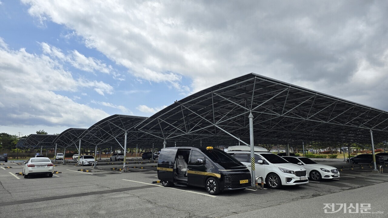 ▲ 실증단지 주차장 방향 모습. 629kW 규모의 태양광 패널이 설치돼 있다. [사진=오철 기자]