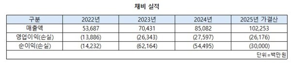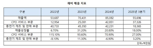 문제는 이익이었다. 채비의 2022년 매출은 536억원이었다. 2023년과 2024년 각각 704억원, 850억원으로 우상향했다. CPO 부문 매출이 같은기간 129억원에서 428억원으로 급증한 게 주효했다. 그런데 같은 기간 영업 손실도 138억원에서 275억원으로 불었다. 인프라 확대를 위한 고정비 지출이 원인이었다.